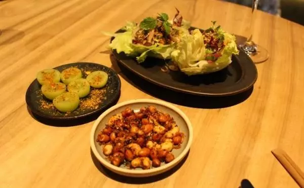 『Dōngxī ナッツ』と『季節のフルーツ海老チリ塩』、『鴨のレタスカップ』
