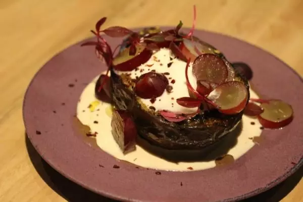 『焼き茄子とぶどうのサラダ』はイスラエルにルーツをもつ料理。そこに、ゴマのペーストやヨーグルトソースを合わせることで、日本人に馴染みのある味わいに仕立てています。焼き茄子とぶどう、一見、味が交わることのないような組み合わせですが、ゴマの風味が強く感じられる酸味のあるソースが全体をまとめあげており、さっぱりと食べられる一品です。