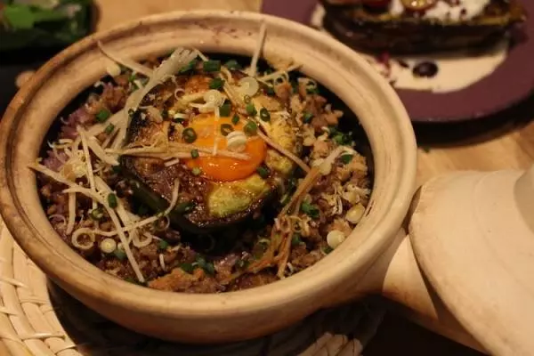 “多様な文化と価値観が混ざり合う「東京」は、時空を超えたシルクロードの終着点なのではないだろうか。” という、ひとつの答えに沿って組み立てられたコース料理のシメは『土鍋ごはん』。台湾の土鍋ごはんをベースに仕上げられており、お米は黒米などの雑穀米がつかわれています。京都の平飼い卵の卵黄や生姜、ネギなどを一緒に混ぜていただきます。アボカドのやわらかい食感に薬味のシャキシャキ感、豚肉ミンチの甘みやナンプラーの旨み、一口で楽しくておいしい! 忘れられない料理です。