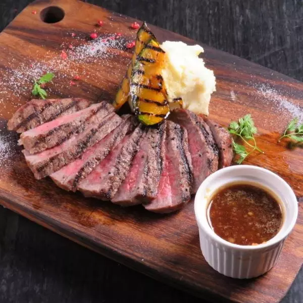 料理も充実していて、しっとりと柔らかく赤身肉の旨味を堪能できる『国産 黒毛和牛のタリアータ』が人気。『佐賀牛霜降りステーキ オニオンソース』は、上質な佐賀牛を焼き薄く切って皿に盛りつけるシンプルな料理。