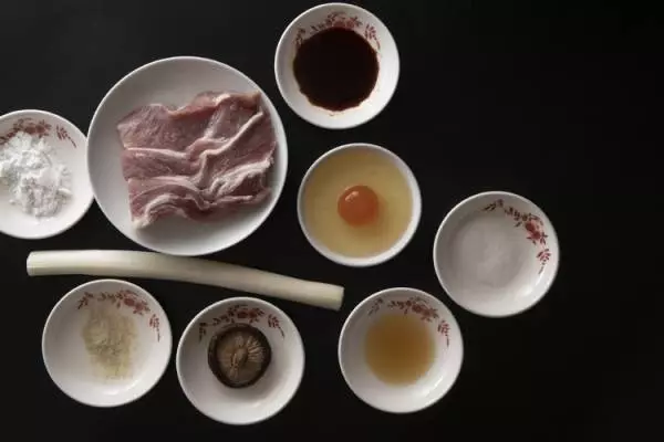 手前左から時計回りに胡椒、片栗粉、豚肩ロース肉、中国醤油(日本の溜まり醤油でも可)、塩卵、塩、ごま油、戻した干し椎茸。中央に置いてあるのは長ネギ