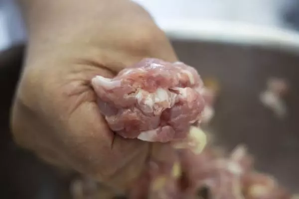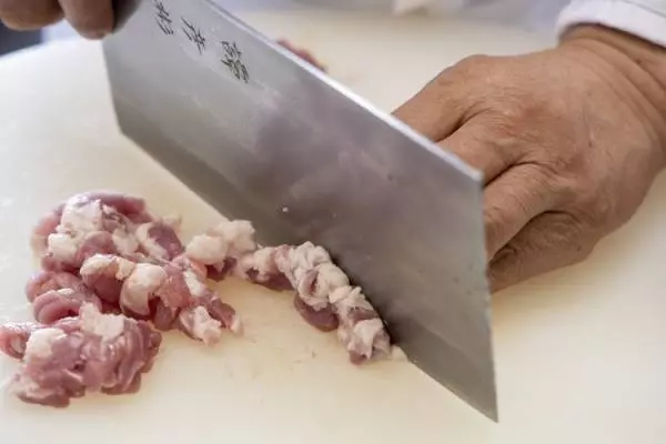 機械を使うと肉の繊維を壊してしまうことになり、蒸しあがったときの食感が悪くなると共に、肉汁が出てしまう。