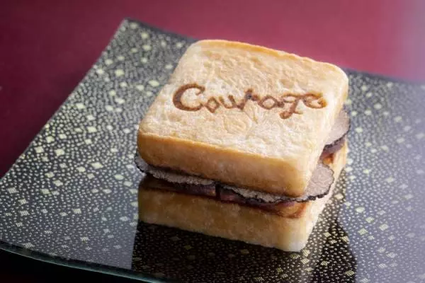 スペシャリテ『鴨と黒トリュフのサンド』。自家製パンに鴨の旨みと黒トリュフの香りが染み込みワインがすすむ。鴨は古屋シェフがコンクールで優勝したときのテーマ食材。コース15,000円~