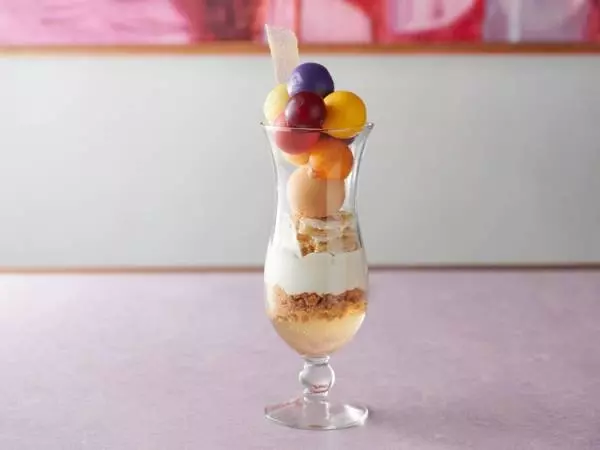 ティータイムにオーダー可能な『季節のパフェ』。この日はカシスやりんごなどの6種類のムースに、キャラメルのアイス、アニスの香りのメレンゲなどを重ねて