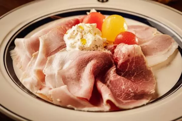 まずは、前菜の一皿。手前にある薄めにカットされたハムでモッツァレラチーズを巻いて食べてみてください! 優しい甘みが感じられるハムと、爽やかなミルク風味でさっぱりとした味わいのチーズはワインと合わせたい逸品。