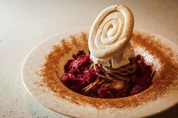 二人以上で訪れた場合は、ぜひこちらのスイーツも注文してみてください! 『チョコパフェ』に次いで人気の高い『モンブランカシス』。渋みのあるモンブランクリームと甘いキャラメルソースの相性は抜群。下にあるタルトや、シャーベット状のカシスの食感など、ひと口でいくつもの食感が楽しめるのもこのスイーツの魅力のひとつです。様々な味の要素が全て個性を失わずに調和されており、ここでしか食べられない新しいモンブランに出会えます。