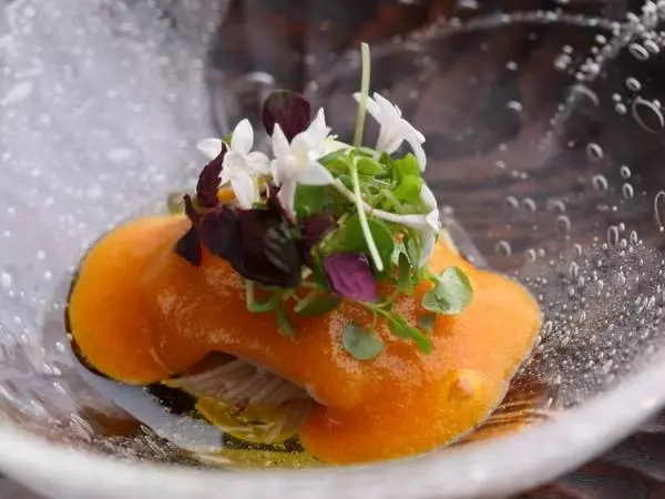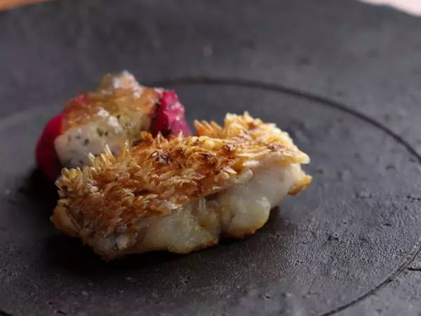 例えば「甘鯛の松笠焼き」。和食ではお馴染みの一品だが、これも予定調和ではない。アフリカのミックススパイス“ラッセルハヌート”が香り、付け合わせに醤油ベースのジュレを纏ったドラゴンフルーツが用いられている。こちらの想像を軽々と超える組み合わせに、一瞬、奇を衒っているのかと勘ぐってしまったが、実際に口にして、すぐに反省することになった。ラッセルハヌートが松笠焼きの香ばしさを盛り立てていること、ドラゴンフルーツのほどよい甘さとねっとりした具合が、甘鯛の味わいとパリッとした鱗の食感を引き立てていることを実感し、角谷さんの自由な発想に拍手喝采したくなった。