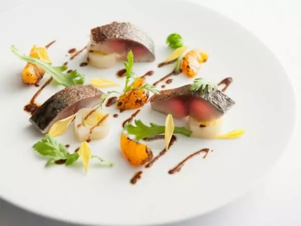柑橘の酢で締めた秋鯖を2種のソースで楽しむ『秋鯖のマリネ 春菊とみかん』 2,600円