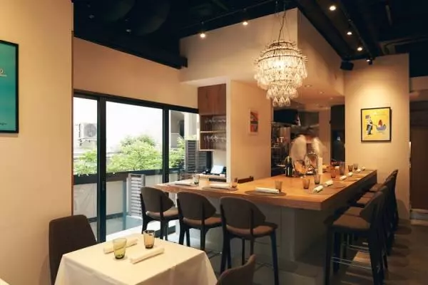 六本木交差点からすぐの好立地にありながら、知らないと通り過ぎてしまう超隠れ家フレンチ【Rn】。扉を開けると、フレンチでは革新的なオールフラットのオープンカウンターが出迎えます。
