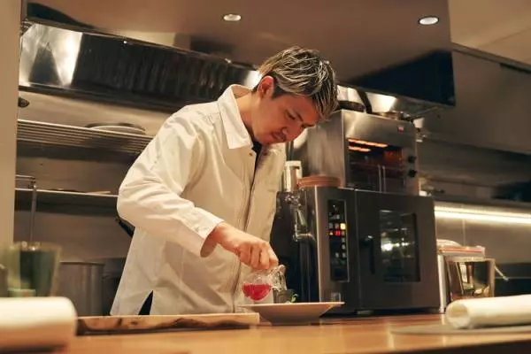 オープンカウンターで腕をふるう大和田シェフの料理は、楽しい“二面性”が特徴。