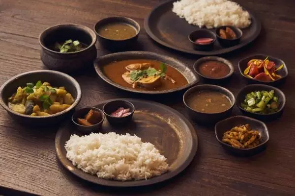 ネパールの国民食、ご飯、豆のスープ、おかずなどの総称『ダルバート』
