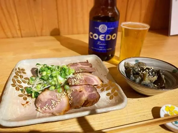 定番メニュー『焼豚皿』で乾杯。写真はハーフサイズ 400円(税別)