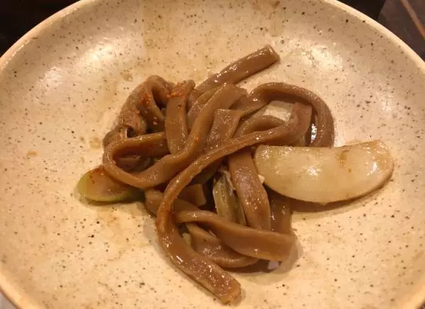 メニューは「煮込みうどん」のみで、醤油味か味噌味かを選べます。普段は醤油派のわたしですが、この黒うどんには味噌を合わせたくなります。味噌スープは一見こってり系に見えますが、意外とあっさり。だから味噌で煮込んでも麺の風味はしっかりと感じられます。