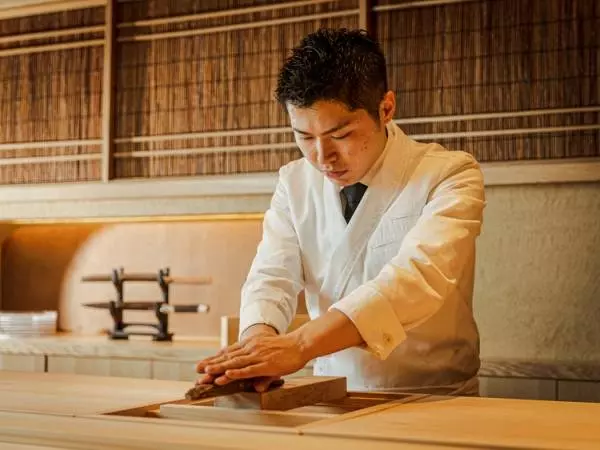 【炎水】の店主、伊藤龍亮さんは【日本料理 龍吟】で9年半働き独立。最初はサービスを2年、次の4年を煮方、3年を炭焼き場と要のポジションを任され、副料理長として同店を支えてきた。師匠の山本征治さんからは、自分の目の前にあるものではなく、例えば椀ものなら、ゲストがふたを開けた時に感じる香り、味わいをどう感じて欲しいか、完成形を考えて料理をすることを徹底的に教え込まれた。