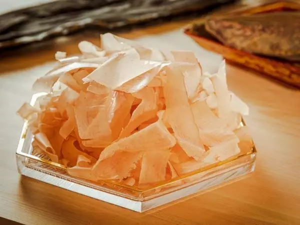 削られたばかりの鰹節。一片が長く、艶がある。「薄すぎても厚すぎてもダメなんです。削るというより、適度に薄く均一に切るイメージですね」と伊藤さん