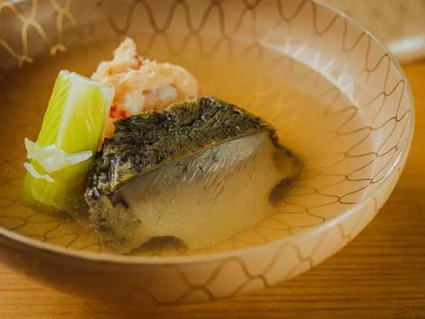 この日の椀種は、徳島のアワビと海老真丈。6時間蒸したというアワビは、歯をあてるとしっとりと柔らかく、素材そのものの塩味がほどよく中まで染み込んでいる。海老真丈は優しい甘さがあり、添えのうるいの苦味はいいアクセントだ。磯の香り、海老の香り、うるいのほろ苦い香りを、だしが一つにまとめて、調和する。素材の味が染み出し、だしは、どんどん春を湛えた味に変化していく。