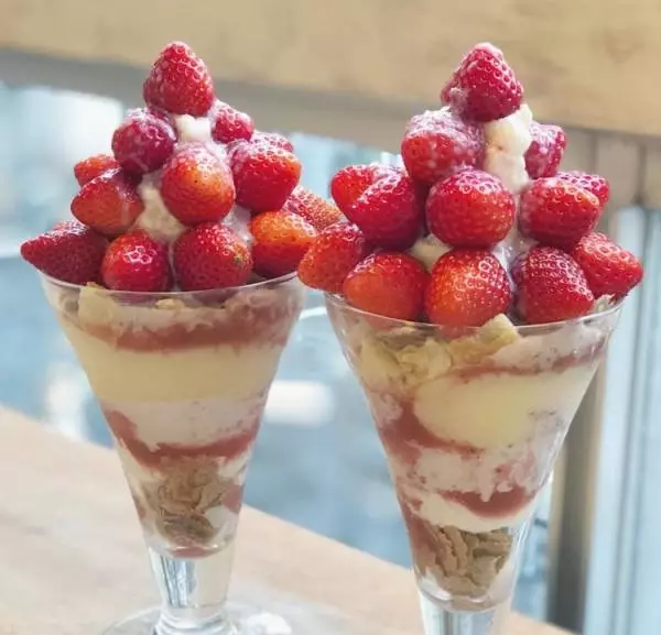 SNS映えするパフェが話題となり行列が絶えない【ソビノワ】でぜひ食べてほしいのが、『まんまる苺のパフェ』。グラスにはイチゴソース・イチゴムース・ジェラート・パイなどが折り重なり、その上はこれでもかというほどたくさんイチゴが盛り付けられています。見た目のかわいさとは裏腹に、甘さ控えめの仕上がりなのもうれしいポイント。ほか季節限定のメニューもあるので要チェックです。