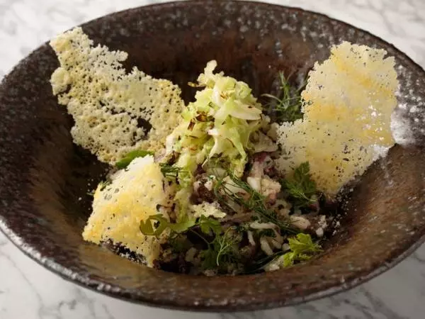 羊と山羊のミルクからできた「ケファログラヴィエラ」。この、クセのないハードチーズに自家製シロップをかけてソテーすることで、キャラメリゼされたように香ばしく甘い仕上がりに。こちらは白ワインによく合います。