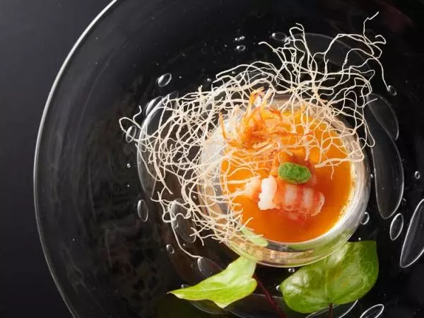 濃いオレンジ色が特徴の恵壽卵を使ったムースの上には、生の雲丹や海老の素揚げ、カダイフが乗り、さまざまな食感を楽しませてくれる。