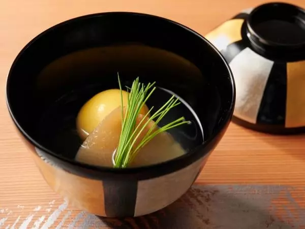 お椀の蓋を取るとだしの香りが広がる。まずはだしを味わおう。そして、白玉をつついてほしい。割れたところからすっぽんのスープが広がって、味変を楽しむことができる。