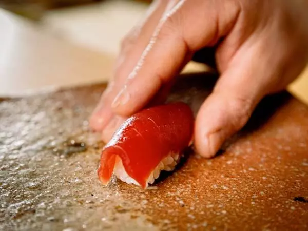 マグロはアイルランド産。赤身は切りつけてから煮切りに軽く、くぐらす程度に漬け、“づ”にして握る。「こうした江戸前の鮨の仕事が好きなんです。」とはムンさん