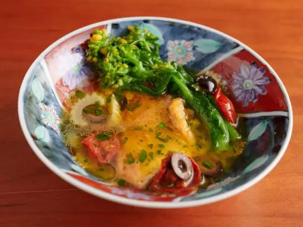 旬のメバルを使ったアクアパッツァ。セロリとドライトマトを用い、軽い味わいに仕立てている。
