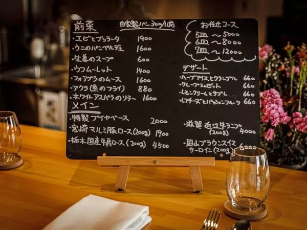 カウンター上に置かれた小さな手書きの黒板メニューが可愛い。ランチタイムには、3,000円のコースのほか手軽なワンプレートランチもある。