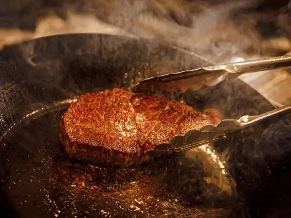 さて、オーラスは、件の『滋賀近江牛のランプ』。飼育期間2年半の処女牛だ。もちろん「サカエヤ」の新保さんが手当した肉だ。河村シェフは、その200gの塊を、まずはフライパンでこんがりと綺麗な焦げ色が付くまでアロゼ。その後、200℃オープンで2分。次にオーブンから取り出し休ませるせことまた2分。これを3回繰り返し、見事なロゼ色に焼き上げたステーキは、霜降りのいわゆるとろけるような肉とは一味違う噛み締めるおいしさが、何と言っても持ち味。味わうほどに肉汁が舌に広がり、肉本来の濃い旨味が後を引く。ソースはフォン・ド・ボー、付け合わせはドフィノワ(じゃがいものグラタン)とクラシックな一皿にまとめている。