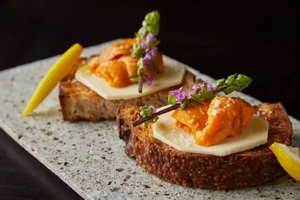『生ウニとカンパーニュ』(1,650円・税込)。ホテルの敷地内にある、アラン・デュカスがプロデュースするレストラン【ブノワ 京都】で焼いたカンパーニュに、生ウニとバターをたっぷりとのせて