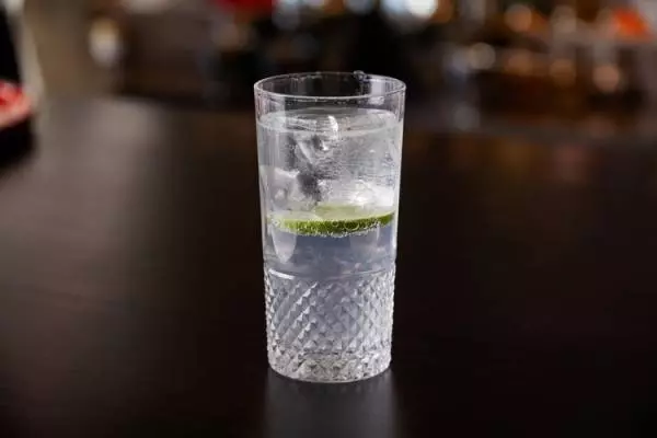 美しいカットグラスの中には大き目の氷が一つとその下にライムが一枚。きめ細やかな炭酸の泡が清々しい一杯です。「ジントニックで大切なのが清涼感。ここに今回一番重点を置きました。氷とライムで炭酸が逃げるのを極力カットし、最後の一滴まで香りと清々しさを楽しんでいただきたい」。最後の一滴までという西田さんの言葉通り、隅々にまで神経が行き届いています。