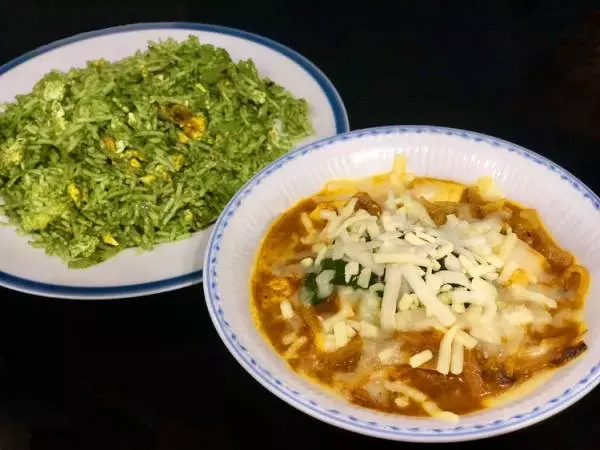 オリジナルカレーの『エメラルドフィッシュカリー』1,480円と、緑色のライス『ガーデンライス』1,000円
