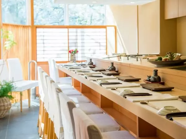 目黒川の桜並木沿いに静かに佇み、春の桜に夏の新緑、そして時には趣ある雪景色も楽しめる洗練された鮨店です。木曽檜でつくられた奥行きのあるカウンター席は、ゆったりとしていて抜群のくつろぎ感。ランチタイムは、大きなガラス窓からやわらかな陽射しが降り注ぎ、女性が一人でも気兼ねなく来店できるあたたかな雰囲気です。日頃の疲れも癒されるような至福の味わいを、自分へのご褒美に。
