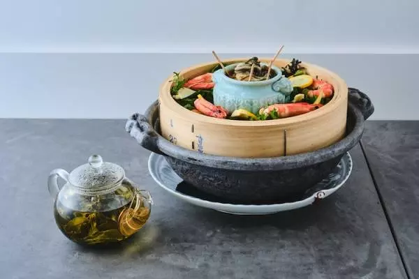 鍋の上に置かれた蒸籠とガラスのティーポットに入った台湾烏龍茶