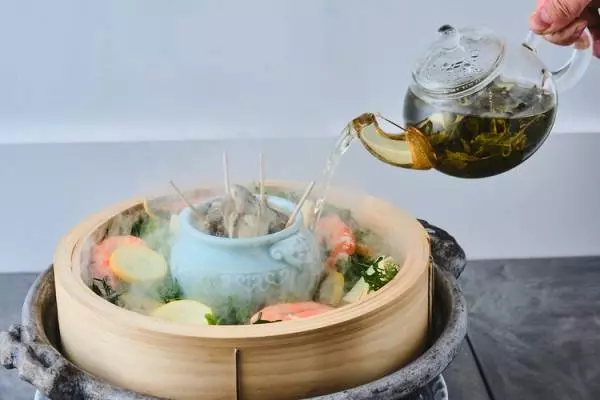 蒸籠の下には焼き石が置かれており、台湾烏龍茶を注ぐと瞬時に蒸気を発し始めます。このまま蓋をして2分ほど蒸しあげます。