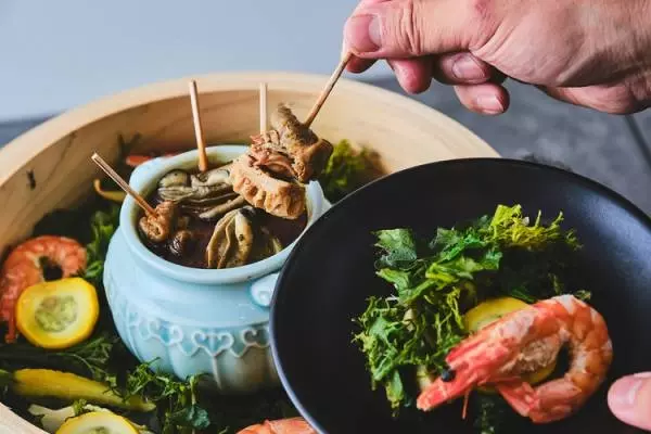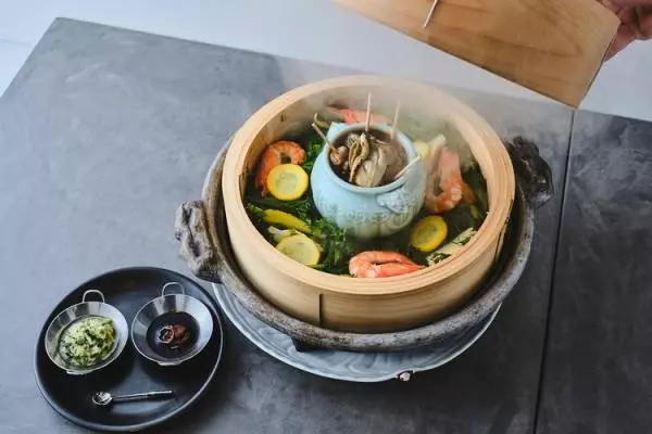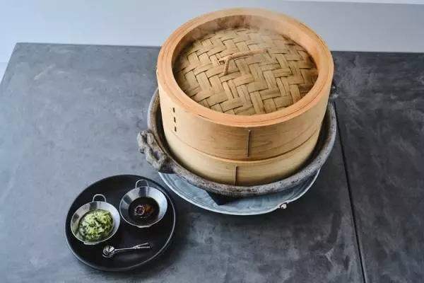 蒸しあがり蒸籠の蓋を開けると中に残った凍頂烏龍茶の蒸気が溢れ出て、柔らかく香ばしい薫りが辺り一面に広がります。海老とズッキーニが鮮やかに色づき、葉物の緑も深みを増し目にも美しい料理に仕上がっています。