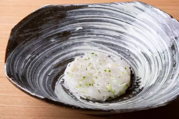 例えば、コース2品目の『白エビのビーフン』。いきなりビーフン!と思いきや、その様相はビーフンのイメージを完全に覆す。器に入ったそれは、白エビと白いビーフンが絡み合いつつタンバル状にまとめられ、見るからに涼やか。所々に散らばる緑はシブレット。口にすれば、新生姜の淡い風味がアクセントとなり、白エビのたおやかな甘味を殺すことなく引き立てている。見た目はシンプル、かつ、素材の風味を生かしつつも、意表をつく味の構成は確かに創意的だろう。