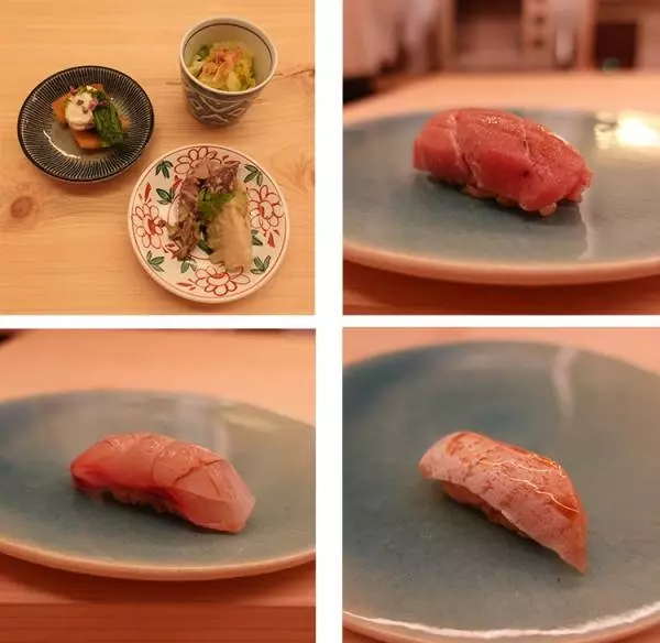 左上から、先付け3品、中トロ、津本式白身、本鱒