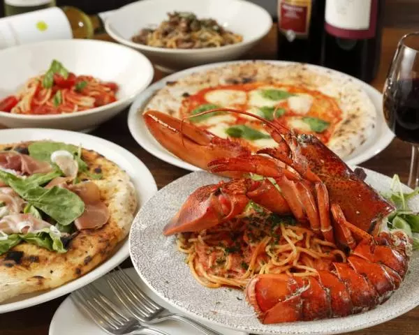 パスタやピザをはじめとしたイタリアンがいただけます。『オマールエビのトマトソーススパゲッティ』は、オマールエビを豪快に調理し濃厚な旨味を凝縮。テラス席でBBQを楽しめる飲み放題付きプランも人気で、ランチタイムにも予約できます。