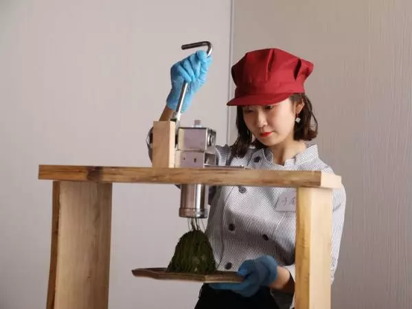 味覚以外でもモンブランを楽しめるよう、モンブランの仕上げは各テーブルで。可動式の絞り機を使い、シェフがゲストの目の前でモンブランを仕上げてくれます。和栗ペーストが極細のモンブランになる瞬間はシャッターチャンスです。視覚の次は嗅覚。和栗やお茶が持つ、素材本来の芳醇な香りが楽しめます。