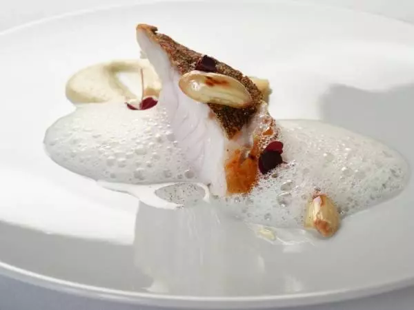 シェフの得意食材の一つでアラを使った料理。食感の変化が楽しめるように皮目はパリッと香ばしく焼き、対照的に白身はレアに仕上げています。ソースはバニラのオイルに魚の出汁を泡にしてミックス。風味豊かな生の落花生のペーストとローストしたものを添えていただきます。