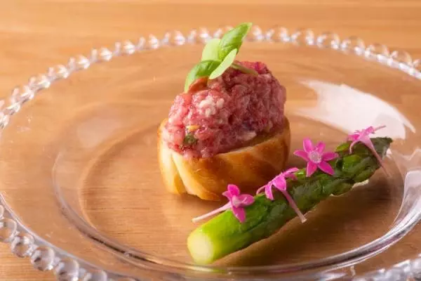 例えば、名物のタルタルとユッケ。一見、似たり寄ったりの生肉料理のように思えるが、岡田シェフの手にかかれば、全くニュアンスの違った一品となる。カリッと焼いたバケットにのせられたタルタルは、とろける美味しさを味わって欲しいとの思いから霜降りのサーロイン(取材日は神戸牛)を使用。これを細かく刻み、ブルーチーズや食用花のペンタス等々を混ぜたそれは、ワインを呼ぶ大人の味わいだ。