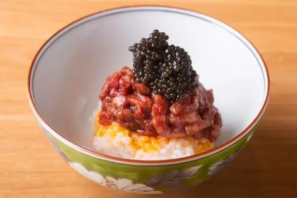一方、ユッケはご飯の友。こちらは赤身系の肉を用い(取材日は松阪牛のイチボ)、しっかりとした食感を楽しめるようにと細切りにし、やや甘辛のタレとあえている。これを白飯に乗せ、これでもか!と言わんばかりにキャビアをトッピング。焼肉店定番のユッケも、ここでは、ラグジュアリー感を纏いスペシャリテにふさわしい一皿となっている。