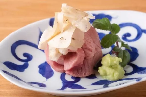 『タン刺し』にはトリュフ。トリュフの産地は季節で変わり、取材日はブルガリアのトリュフを皮を剥いて使用。