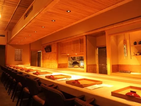 店内は柔らかな陰影のある聚楽壁に、木をふんだんに用いた内装。竹網代や杉柾網代などの天井、柱一本までも表情豊かで、深い趣きを感じさせてくれます。カウンター、テーブル、掘りごたつの個室があり、シーンに合わせて使い分けがかなうのもうれしいところ。器は料理に合わせ、永楽(清水焼)やバカラなどが巧みに使い分けされ、目でも楽しませてくれます。