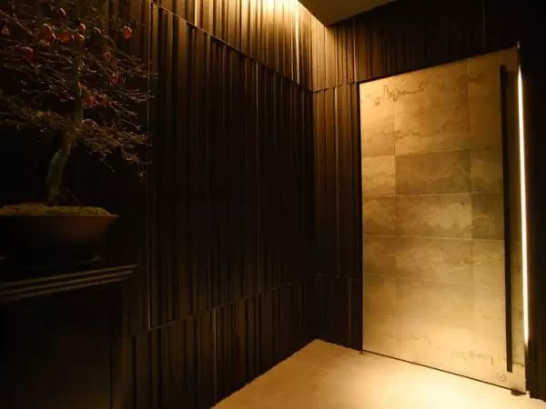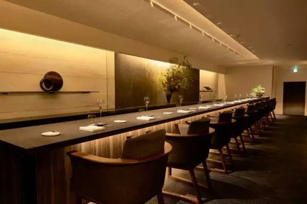 奥へと伸びるカウンターと鈍色の壁面が、シックで落ち着いた雰囲気。店名の「呂色」は、“黒漆の濡れたような深く美しい黒色”という意味だそうで、「ぶれない心」と「新たなる挑戦」というシェフの想いが込められているそう。店内もそのニュアンスを色濃く反映した、非日常空間に仕上がっています。