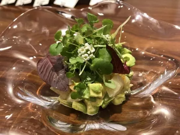 まずはビールを片手に『帆立と海老のタルタル』。濃厚なアボカドとプリプリのホタテとエビ、それをビールがさっぱりと流していく幸福感に浸ります。