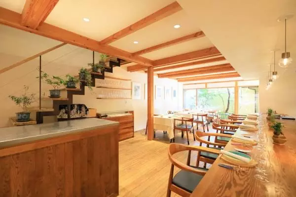 中に入ってみるとお茶屋風の外観からは一転。モダンで明るい空間が広がる店内にはオープンキッチンがあり、オーナーシェフの山地陽介さんが腕を振るっています。2015年にオープンして一年足らずで、京都のフランス料理店として確固たる人気を獲得しています。