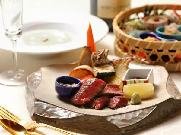 和牛の鉄板焼き、季節の天ぷらなど、吟味した食材を繊細な京の味に仕上げた『ディナー 比叡』7,700円(税込)