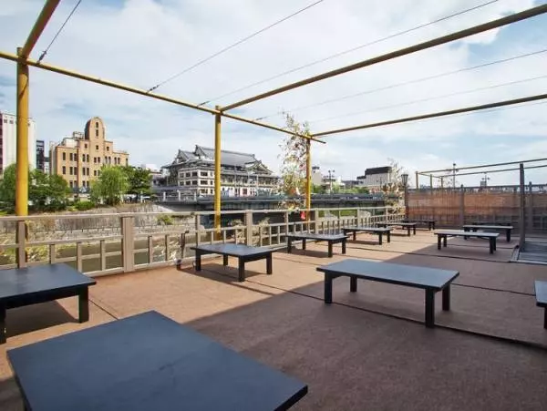 京都の風物詩、川床からの眺めは抜群。川向こうの建物は「京都四条南座」です