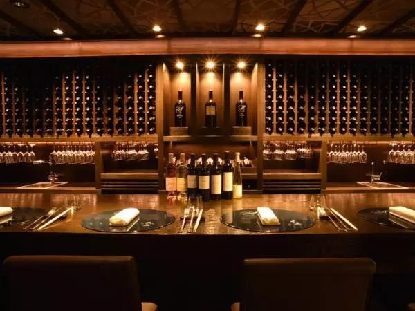 大人のランチデートには、距離感が縮まるカウンター席もオススメ。壁際にずらりと並ぶワインボトルが壮観
